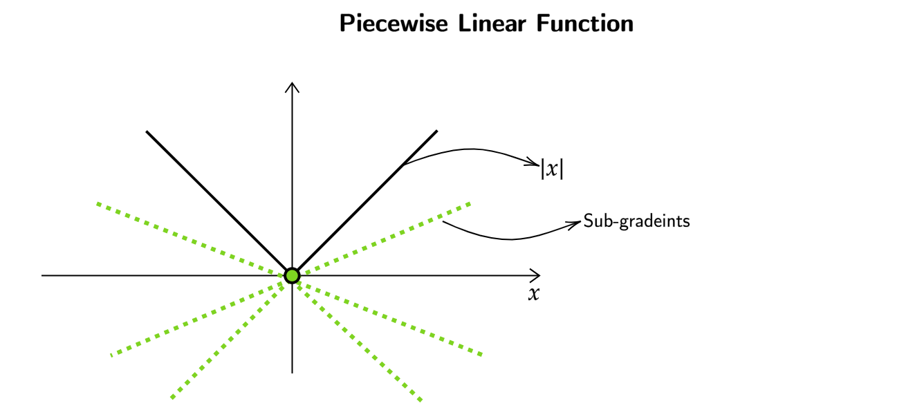 A vector \(g \in \mathbb{R}^d\) is a sub-gradient of \(f:\mathbb{R}^D \to \mathbb{R}\) at a point \(x \in \mathbb{R}^d\) , if