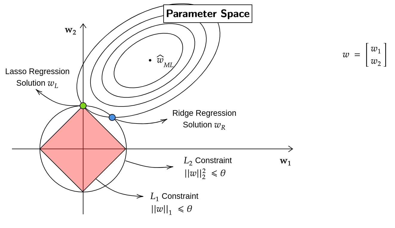 Our goal here is to change the regularizer in ridge regression equation in such a way that the elliptical contours around \(\hat{w}_{\text{ML}}\) hit at a point where some of the features become zero.