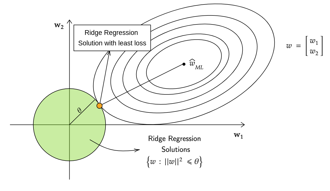 The point where it touches (yellow dot) is the ridge regression solution with the least loss possible when compared to any other \(\hat{w}_{\text{Ridge}}\) in the green circle. In other words that point (yellow dot) is closest to \(\hat{w}_{\text{ML}}\) and yet satisfy the constrained ridge regression equation.