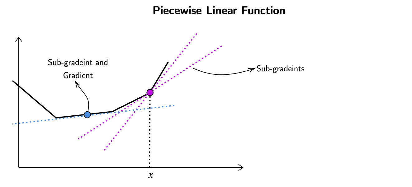 For a piecewise linear function at the point \(x\) (purple) point the function is not differentiable , sub-gradient provide a lower bound for this function at \(x\) (purple point).